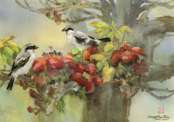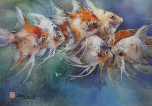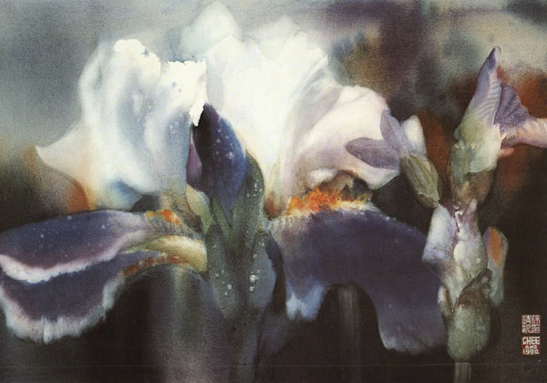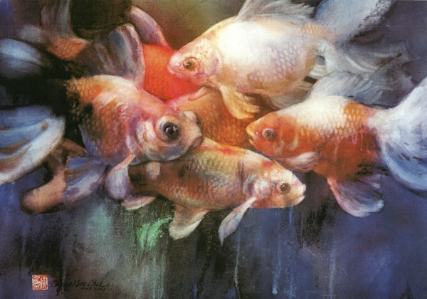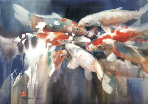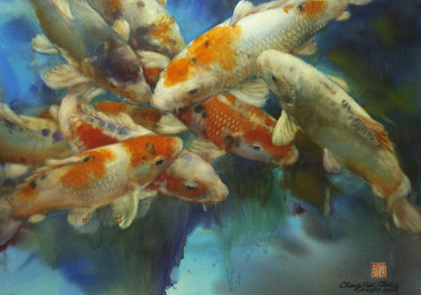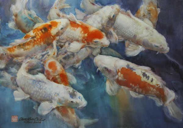 The saturated wet paper allows easy lifting. Therefore I can paint the negative background first, and then lift out shapes of any subject I choose to paint, maintaining soft edges, and a unified background. I use this method for painting subjects such as koi and flowers. Their shapes are generally lighter in value than the negative background, and they have soft edges. When painting fish I try to get the feeling that fish are IN the water, and the two are inseparable. When painting flowers I try to bring out their soft and gentle characteristics. This can best be achieved in the saturated wet technique.