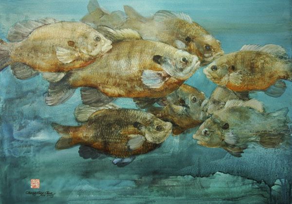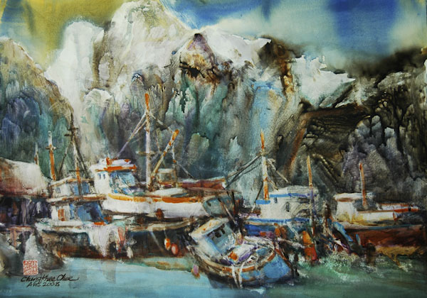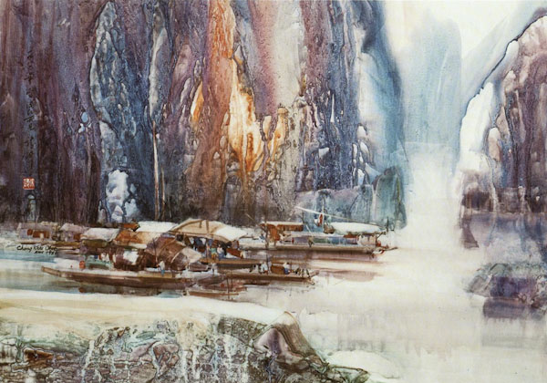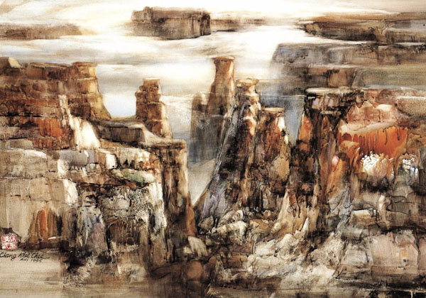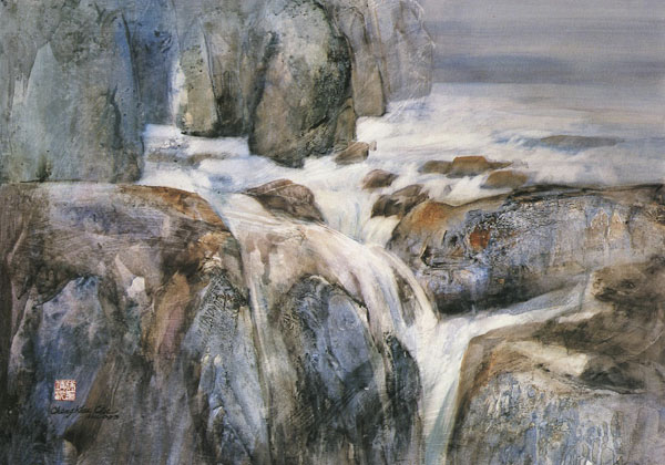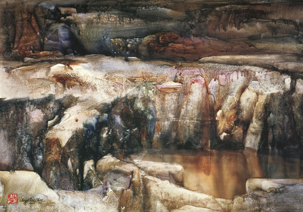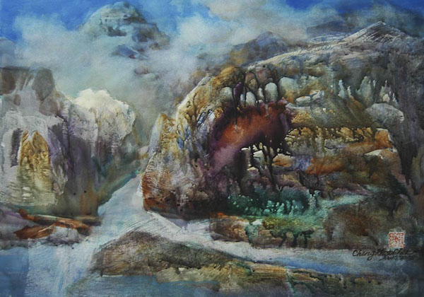 I discovered that when a broad brush charged with color is swept over the glossy gel-medium-coated high-surfaced illustration board, the paint is immediately repelled, and creates exciting textures resembling rocks and mountains. Since the board is very smooth, it is also easy to make changes. I utilize these qualities and take an improvisational approach to paint subjects such as rocks, mountains, and canyons.