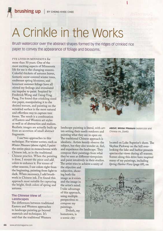The Russian publication Masters of Watercolor compiled by Konstantin Sterkhov features Cheng-Khee and his paintings p. 64 - 73; the text is in both Russian and English. The International Artist Magazine features his article The Saturated Wet Paper Technique in its Oct/Nov 2013 issue, p.100-107. The Artist's Magazine Brushing Up Column features his article A Crinkle in the Works, p. 66-69.